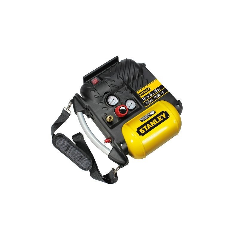 Compresor pistón sin aceite 1.5Hp, caldera 5lts, ligero y de fácil utilización. Compartimento para almacenar accesorios. Correa para transportar fácilmente. 10bar de presión máxima.